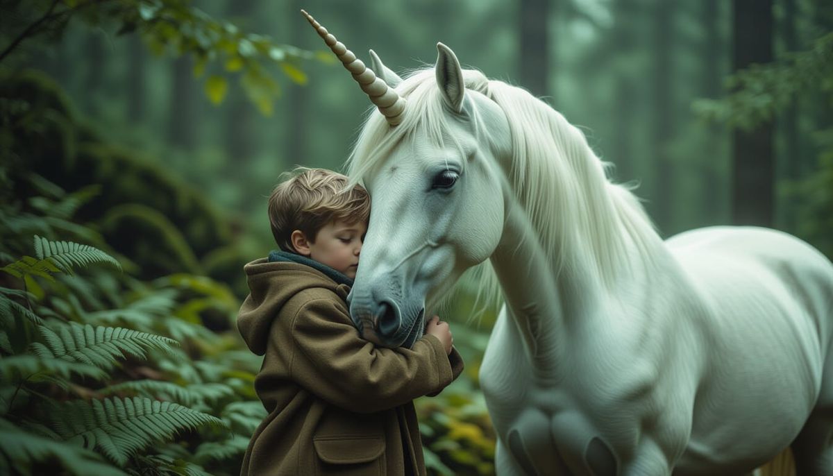 A hyperrealistic cinematic image shows a young boy embracing a large white unicorn in a dense forest, featuring dramatic lighting, film grain, and a vignette.
