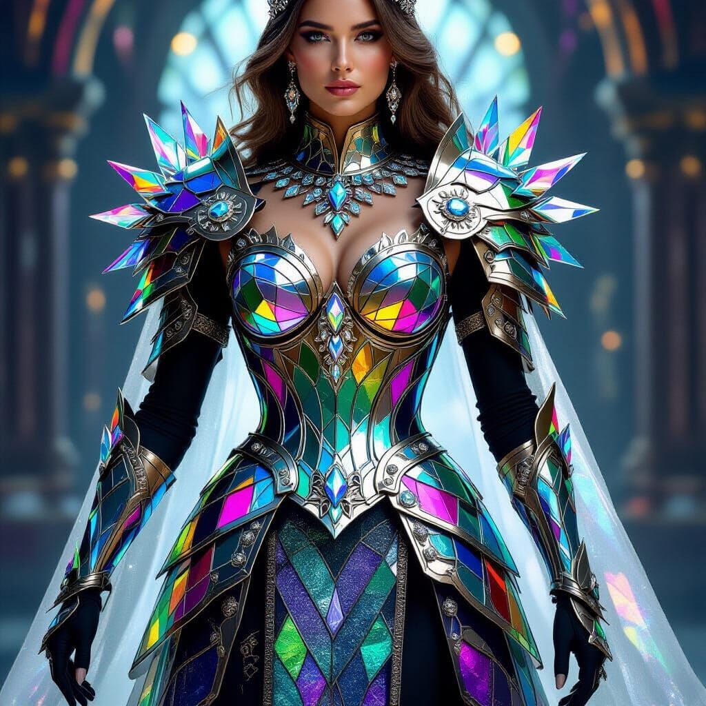 This image depicts a fantasy queen in ornate armor resembling a glass dress, featuring iridescent panes, crystal details, and stained glass patterns. Dramatic lighting highlights its reflective surfaces.