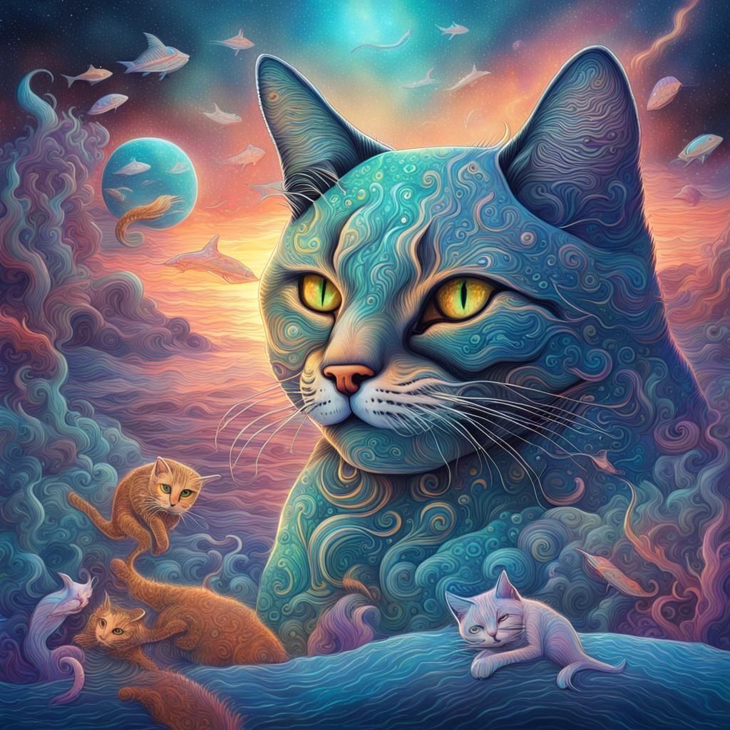 This image shows cats inhabiting an ocean ecosystem. The holographic, astral, and cosmic elements are presented in a mixed media style, reminiscent of visionary art.