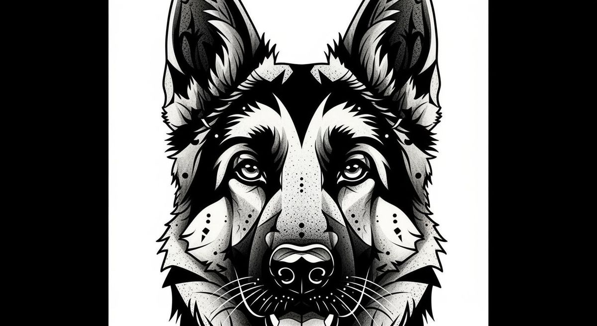This image shows a German Shepherd head rendered in a striking blackwork tattoo style. It features bold linework, intricate patterns, and heavy shading for dramatic contrast, with a focus on detailed eyes and a fierce expression.