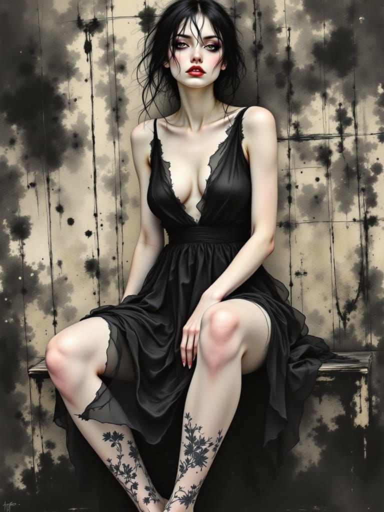 This image shows a serene woman in a black Japanese dress sitting in a desolate, moody landscape, created in a surrealistic style with Japanese ink brush techniques