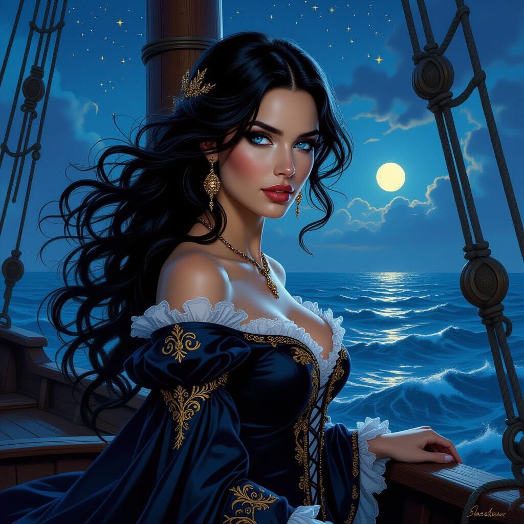 A striking picture of a pirate queen on her ship, gazing at a starlit sea. The image is rendered with dramatic lighting and brushstrokes, resembling romantic art with realistic details.