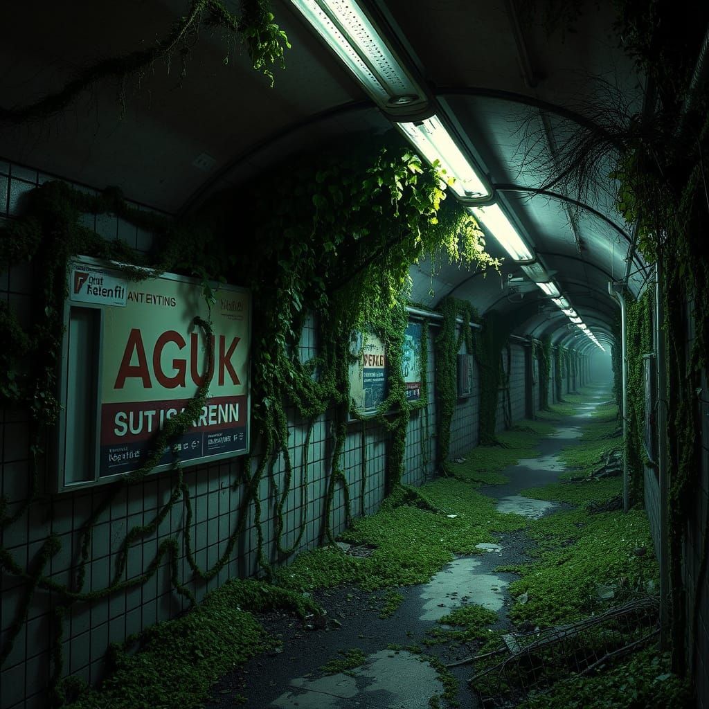 This image shows an abandoned subway station consumed by nature, with vines and moss reclaiming decaying advertisements and tiled walls. A single light casts eerie shadows, evoking quiet decay in a dark, forgotten place.