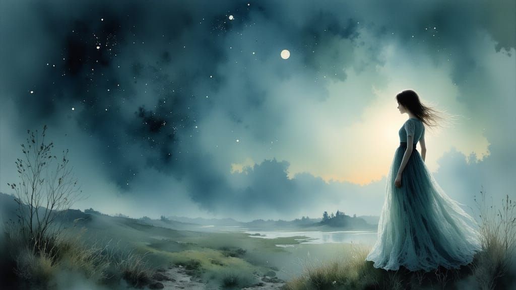 A haunting image of a solitary figure in a desolate, moonlit landscape under a sky full of stars and fog. The metallic horizon adds to the surreal, dreamlike atmosphere in a Beksiński-inspired style.