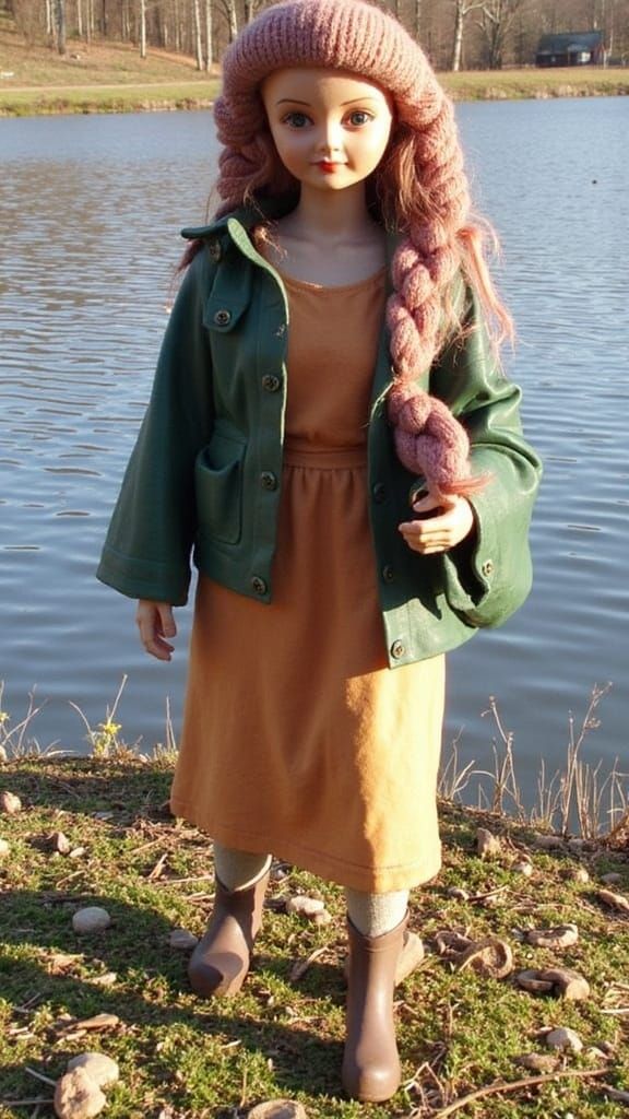 This image shows a stylized doll with a delicate aura of light, standing in a subtle, natural pose. Her body is adorned with a flowing, ornate gown, and her hair is styled with intricate, swirling patterns and subtle wisps of grey and rose hues. Her face is warm and smiling, with a hint of mystery in her...
