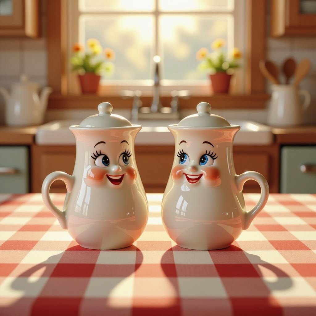 This image shows vintage ceramic salt and pepper shakers shaped like a smiling couple, sitting on a checkered tablecloth in a rustic kitchen. Presented in a whimsical, illustrative style with soft textures and warm colors.