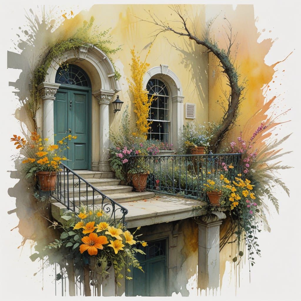 A serene outdoor scene featuring a beautifully adorned porch, exuding refined charm, with vibrant flowers and elegant architectural elements, created in a poetic watercolor style