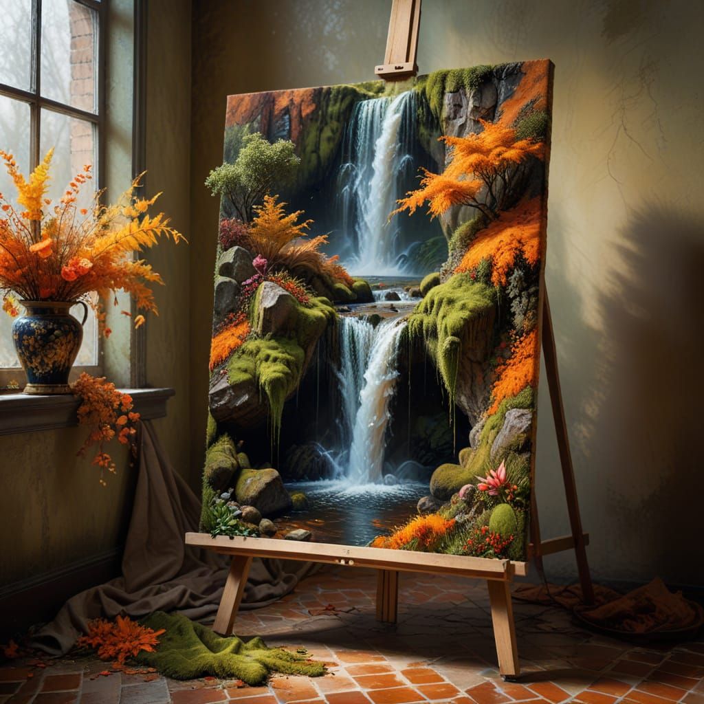 This image shows a surreal moss-colored waterfall flowing from a painting on an easel onto a studio floor, rendered with ultra-detailed oil brush texture and warm autumnal colors.