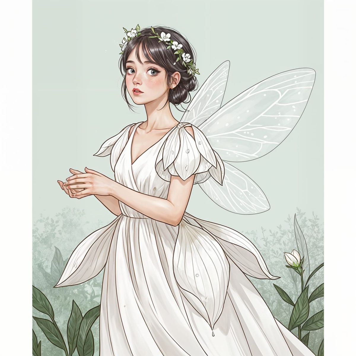 A charming image of a whimsical fairy embodying the Diphylleia grayi flower. The artwork uses soft, bright pastels and delicate lighting to create a dreamy and ethereal aesthetic.