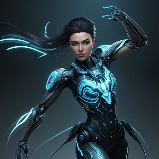 Concept art depicting a woman with detailed mechanical limbs and glowing circuits dancing gracefully. Features polished metallic textures and vibrant neon accents in cinematic lighting.