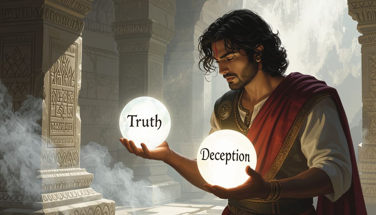 A young man makes a critical choice between truth and deception, illuminated by a radiant orb in a dramatic, mist-filled chamber, rendered in a neoclassical style with strong chiaroscuro lighting.
