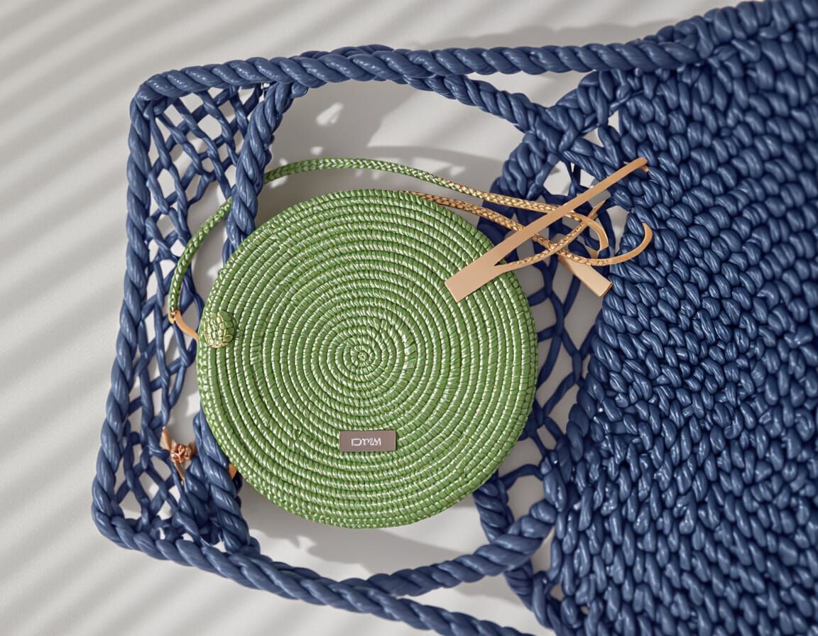 This image shows a green woven circular handbag in ultra-realistic studio product photography. It features intricate stitching, a brand label, and is presented with soft lighting on a white background, highlighting its texture and detail.