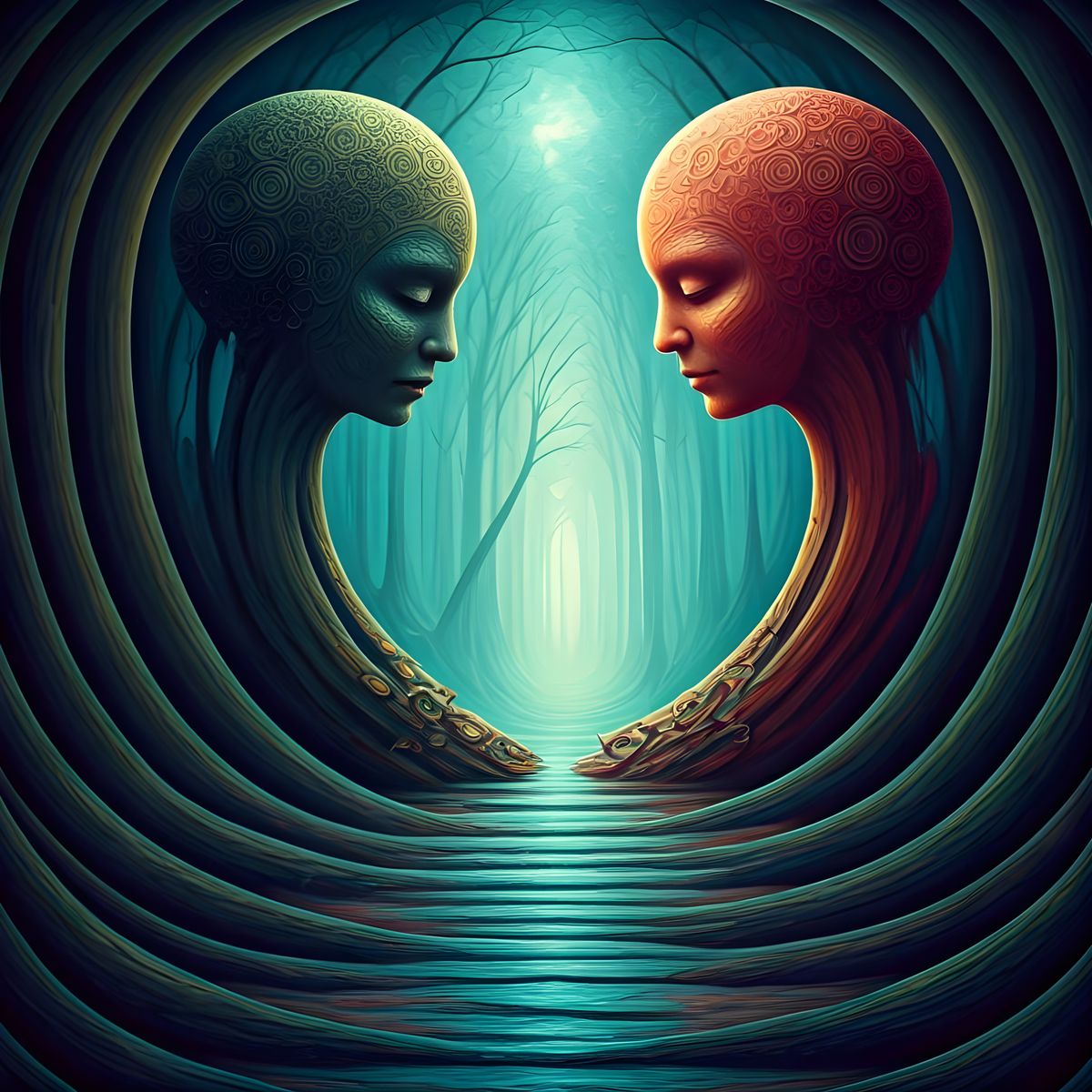 "A mystical, dreamlike atmosphere pervades the scene, as two contrasting entities, interconnected yet distinct, coexist in a state of delicate balance, reminiscent of the surrealist works of M.C. Escher, the vibrant colors and swirling patterns of Friedensreich Hundertwasser, and the eerie, symbolic landscapes of Zdzisław Beksiński, with bold, swirling brushstrokes and intricate, ethereal details."