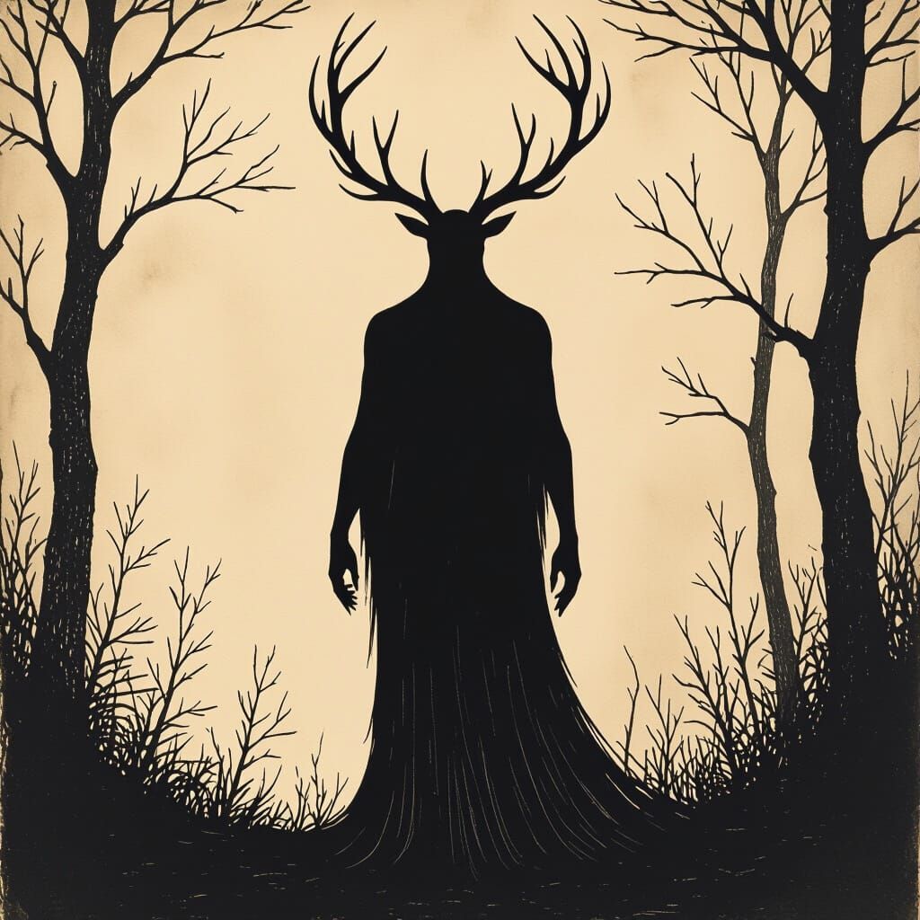 Generate unique folklore-inspired images with shadowy figures and stag antlers. It's free and easy!