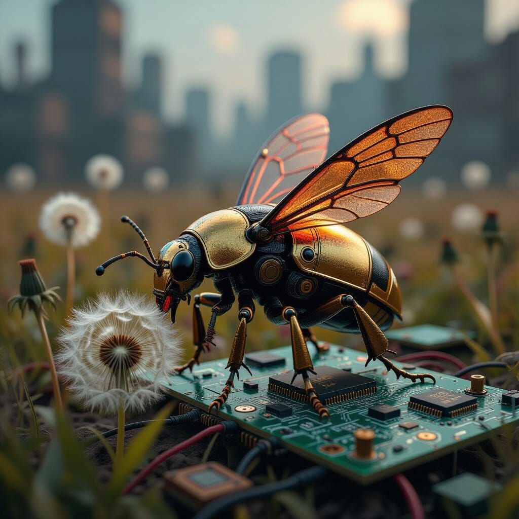 Close-up shot. A mechanical beetle crawls on a dandelion in a field of circuit boards. Digital painting. Hard, metallic colors, harsh lighting. Sharp details, intricate mechanics, hyperrealistic rendering. Best quality, a masterpiece, 8k resolution, trending on Artstation, steampunk aesthetic, industrial, ...