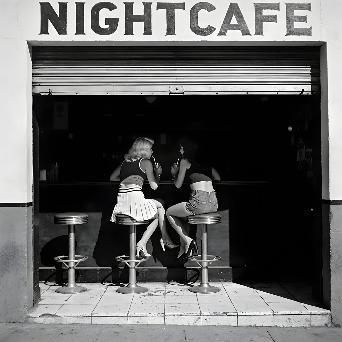 This image captures a street-level view of a bar, focusing on two women inside rendered in a high-contrast, black-and-white documentary style. Their lower bodies are visible, creating a sense of anonymity.