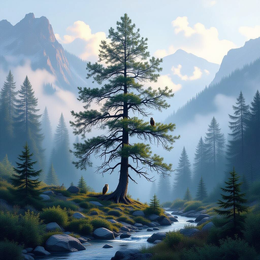 This image depicts an ancient larch tree in Montana's mountains, shrouded in ethereal fog. Surrounded by other trees and a stream, an owl watches from the branches, rendered in a realistic, painterly style.