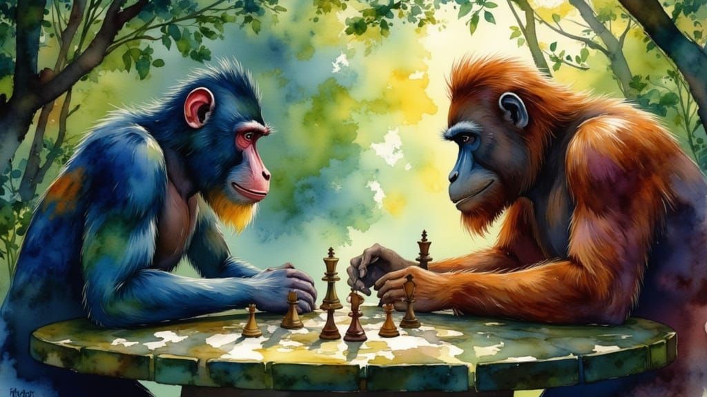 Make unique images of animals playing games, like this mandrill and orangutan chess match. Free and easy AI generation!