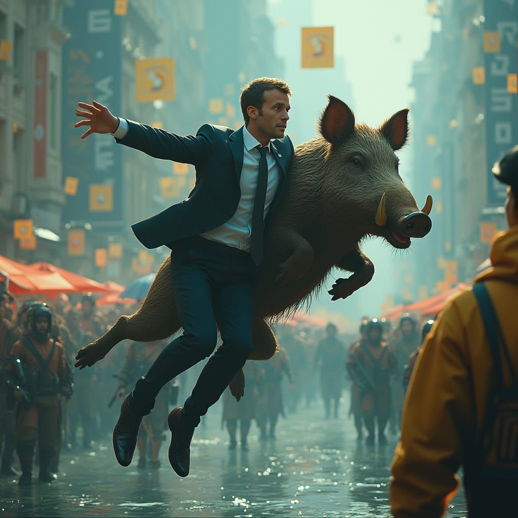 A surreal scene of a suited figure being rescued by a flying wild boar during a Greenpeace protest. The image is rendered in a vibrant, matte style with blue, green and gold hues, reminiscent of fantasy concept art.