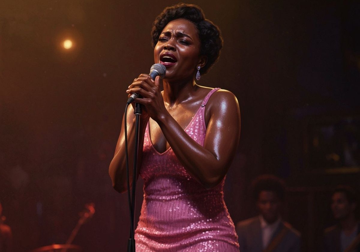 This image shows a Black woman singing in a jazz club. She wears a shimmering dress and sings with emotion. This hyperrealistic digital painting captures the energy of the performance.