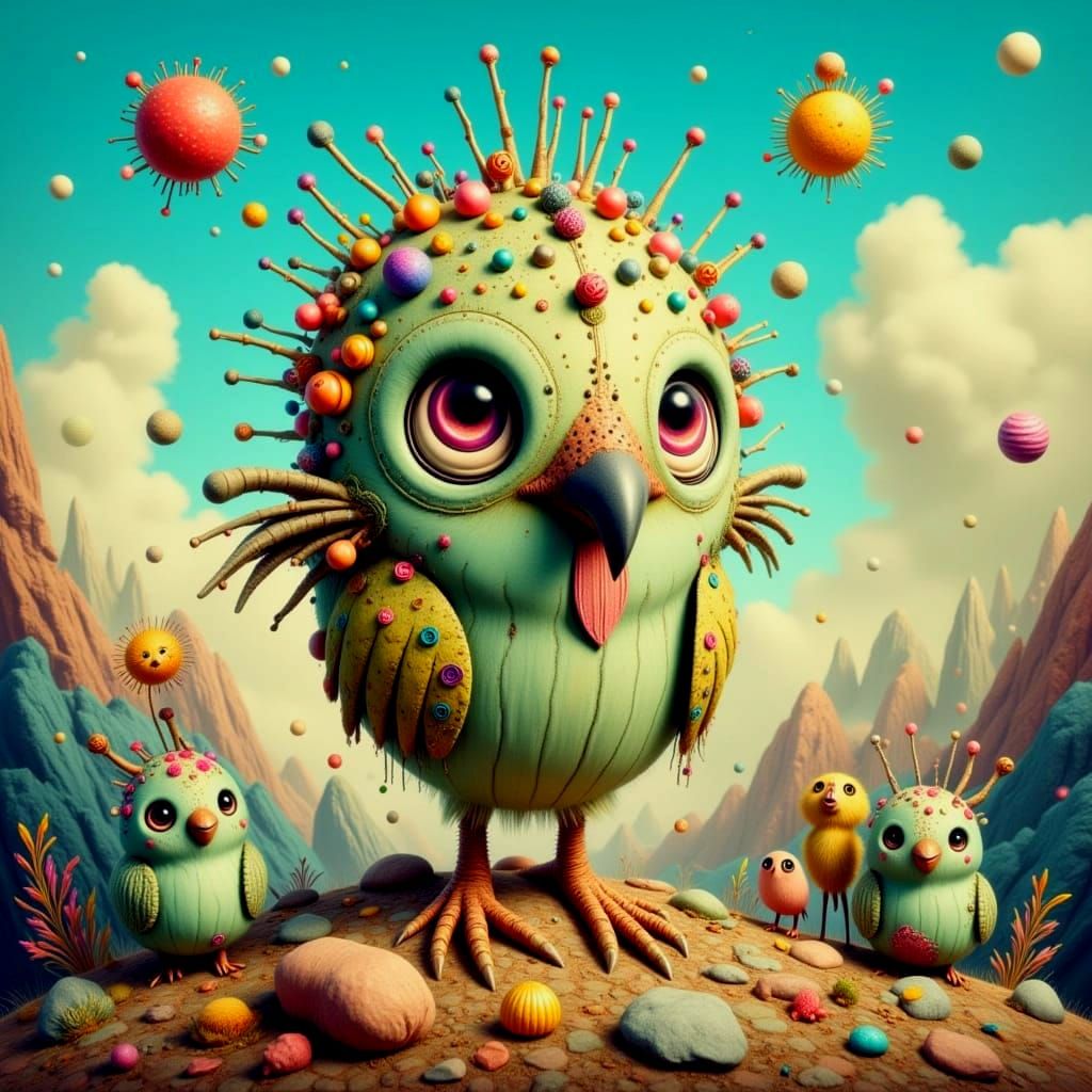 A whimsical illustration featuring anthropomorphic birds with exaggerated features. The central figure is a large egg-shaped adorable bird with a prominent beak, mismatched eyes, and colorful gemstones embedded in its body and stitched with threads and patches. Surrounding it are smaller, quirky bird ...