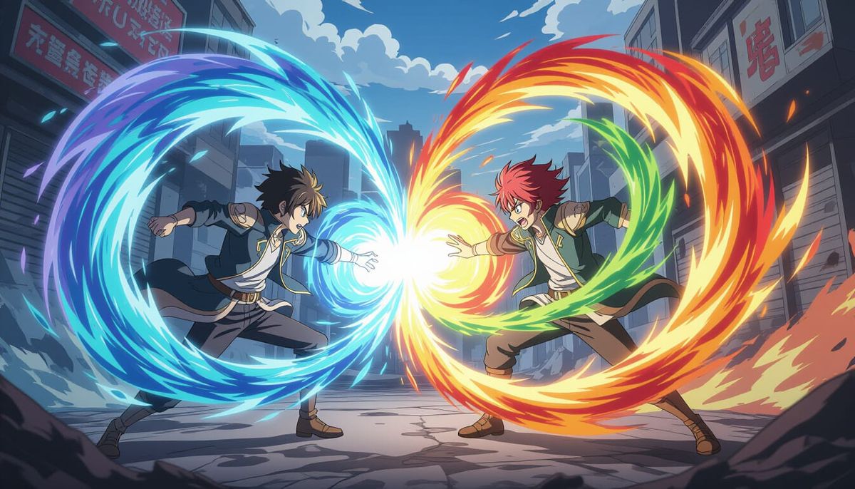 This dynamic image depicts an anime protagonist in battle, their vibrant energy aura swirling around their opponent. Features sharp lines and bold color contrasts characteristic of cel-shading.