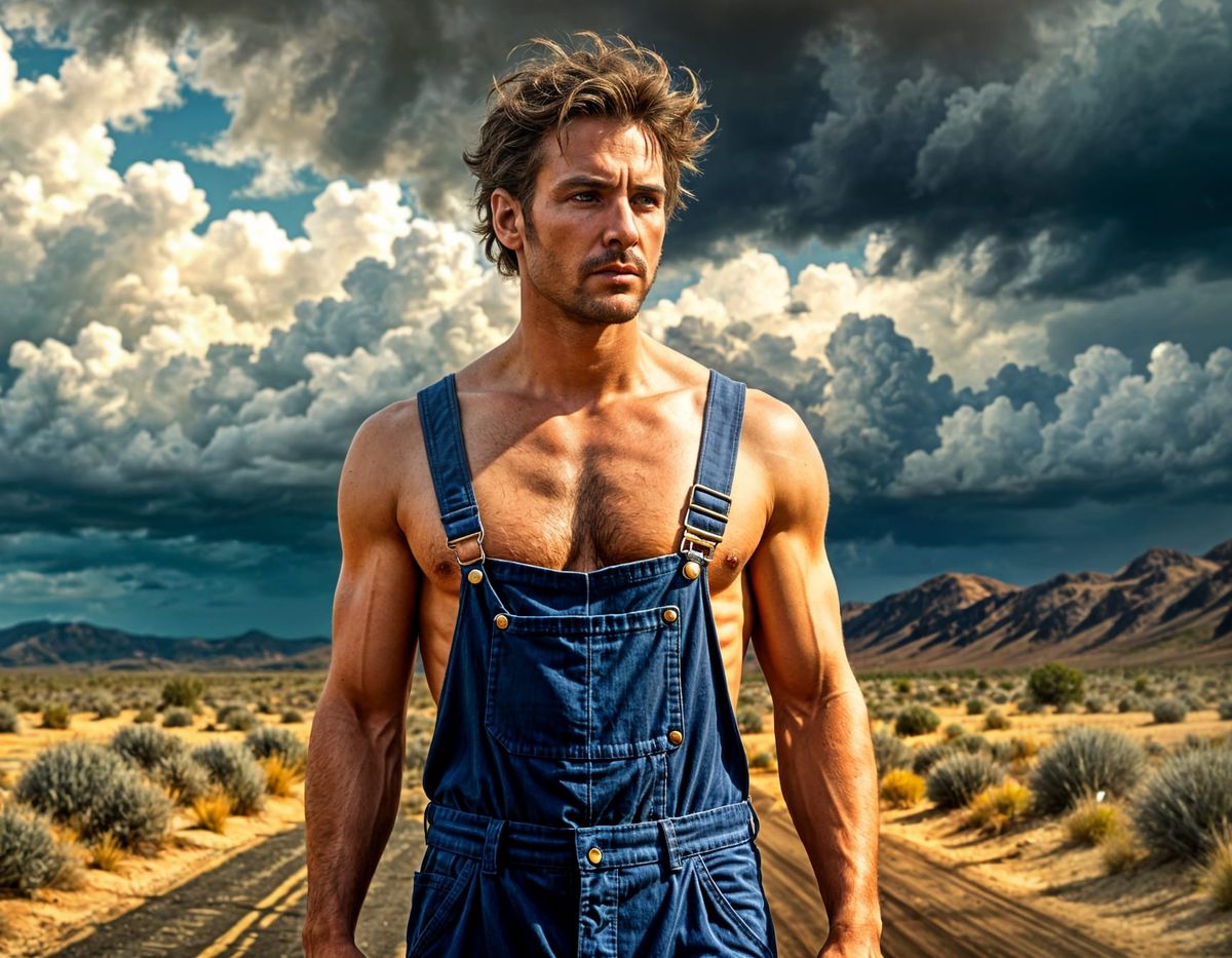 A hyperrealistic matte painting of a disheveled man in overalls, reminiscent of dark fairytale illustration. Features dramatic lighting and a limited palette of golds and blues.