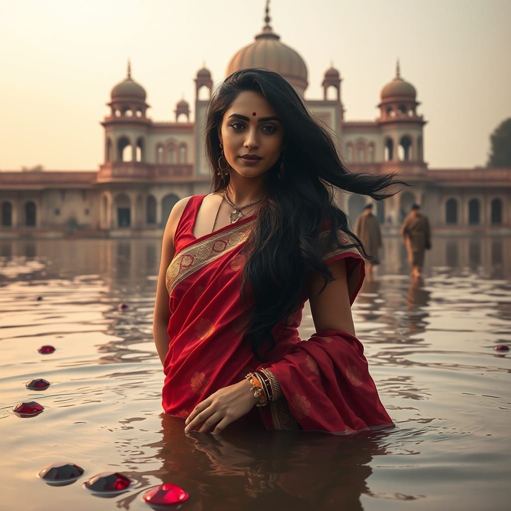 This image shows an Indian woman in a red sari walking in shallow water before a Mughal-style palace. The scene features ruby gemstones, distant figures, and a mystical, cinematic atmosphere.