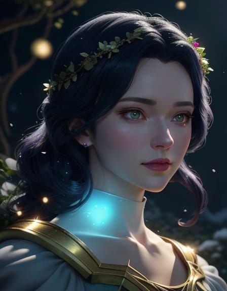 A close-up image of Snow White in a surreal galaxyscape with glowing vines and roses, rendered in a Studio Ghibli style. The digital art features soft, golden lighting and pastel colors.