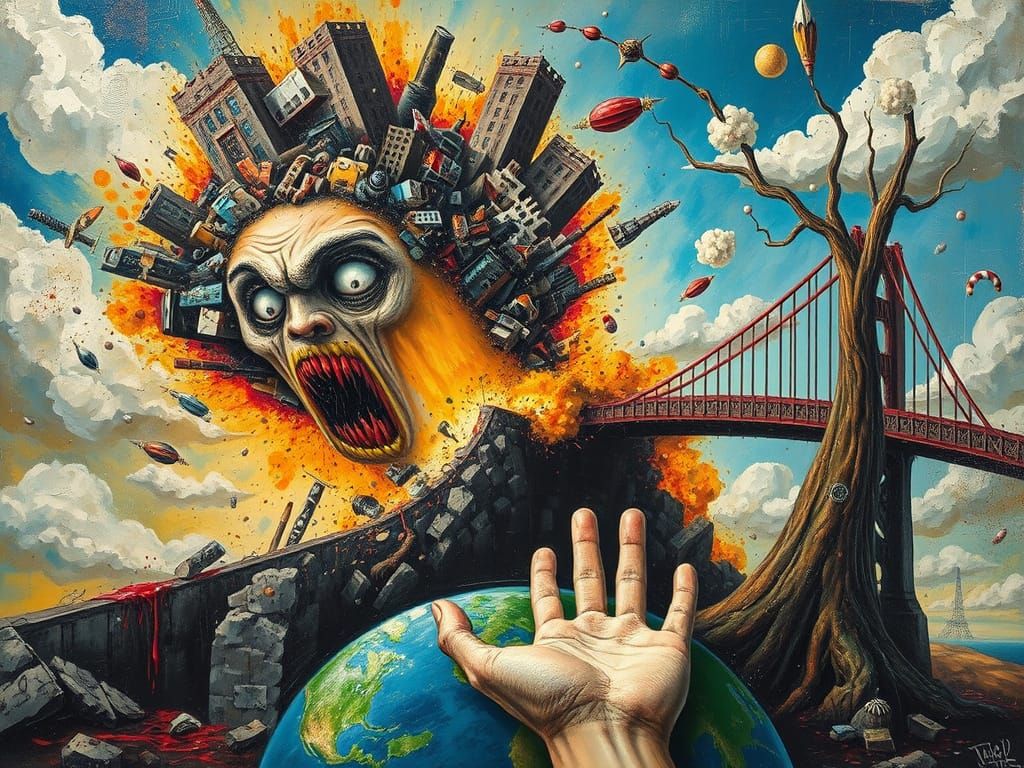 This image shows a vivid, dreamlike explosion scene with debris and a broken bridge, accompanied by a distressed tree and a hand reaching out to the earth, all created in a unique blend of oil painting and mixed media techniques with a whimsical, Tim Burton-esque flair.