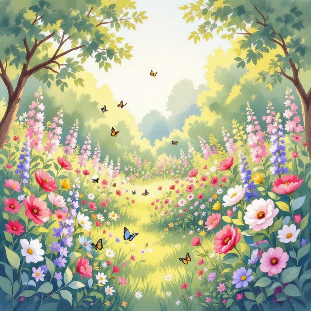 A picturesque image of a garden teeming with life. The scene, rendered in soft, painterly style, captures the essence of fairytale magic with watercolor art and pastel colors.
