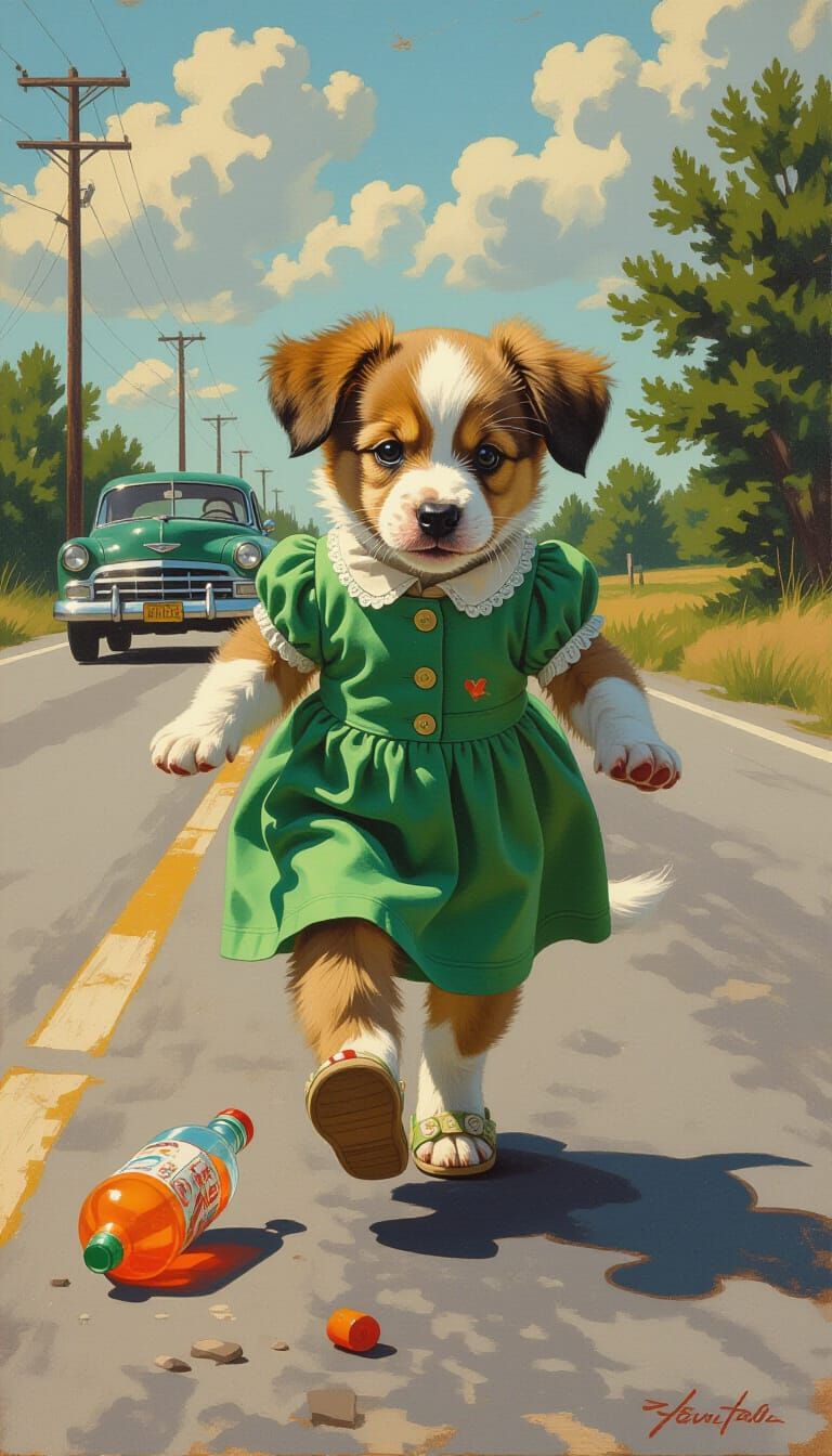 A digital painting capturing a sweet, innocent puppy in a torn green frock running towards the road for a fruit. Dramatic lighting and a muted palette emphasize the poignant, tragic moment.