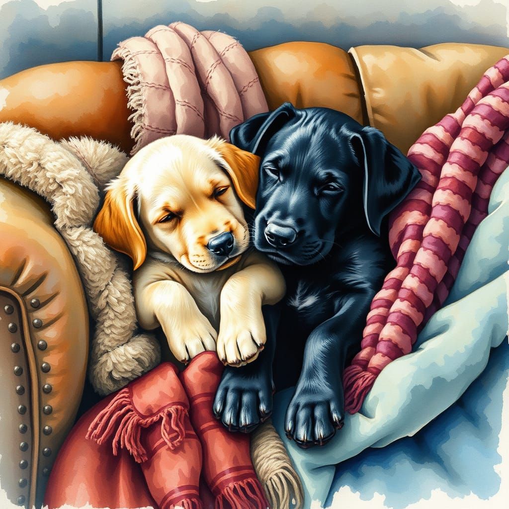 A heartwarming image of a black Labrador and golden retriever puppy cuddling on an old couch. The artwork is rendered in vibrant watercolor and alcohol ink wash, with gouache accents.