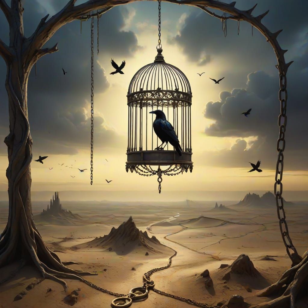 This image shows a surreal birdcage hanging in a desolate landscape, featuring a lone raven. Created with painterly, gothic, and atmospheric digital art techniques.