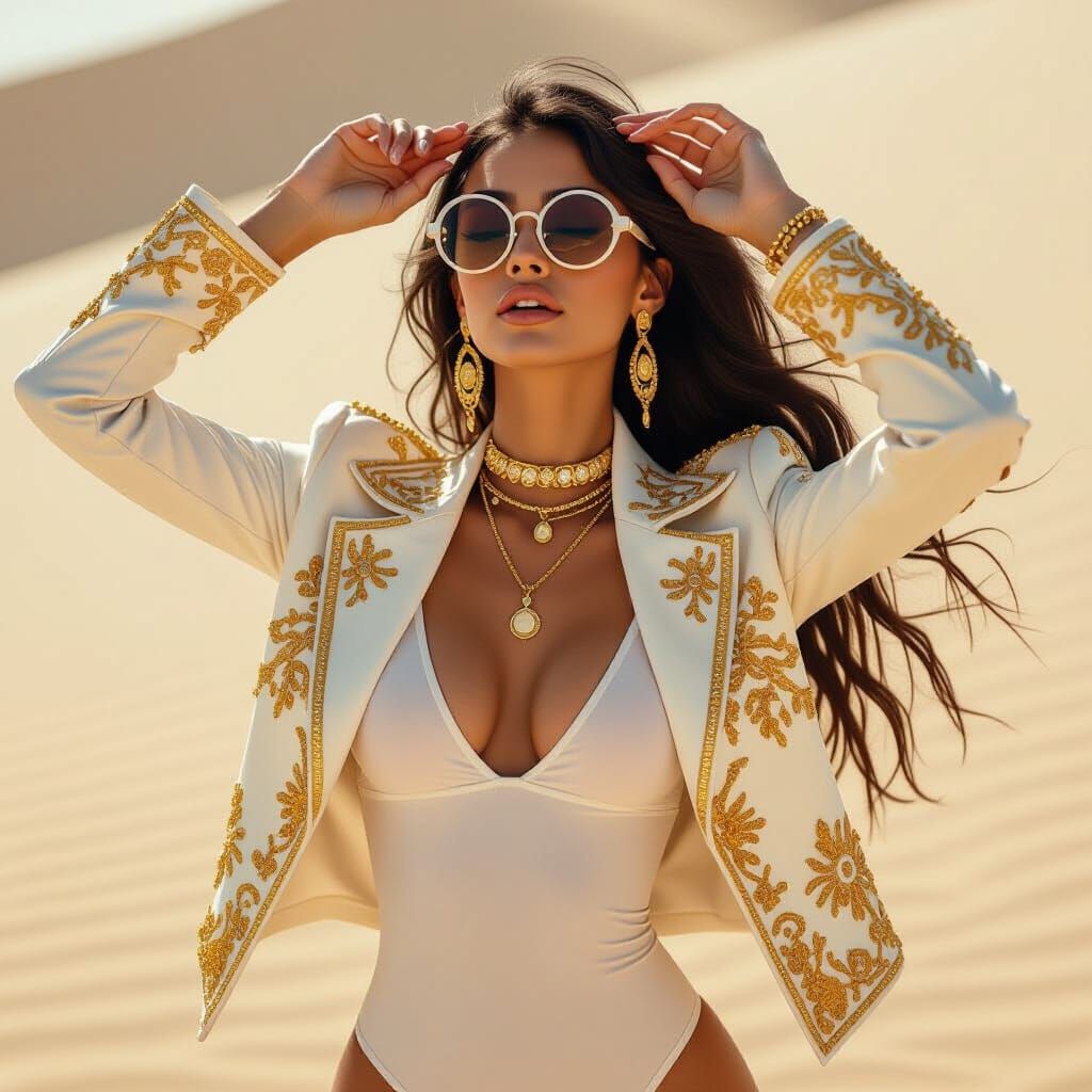 This image shows a young woman dancing on a sandy terrain, wearing a white bodysuit, gold jewelry and sunglasses. The modern bohemian style features intricate details and deep, complementary colors.