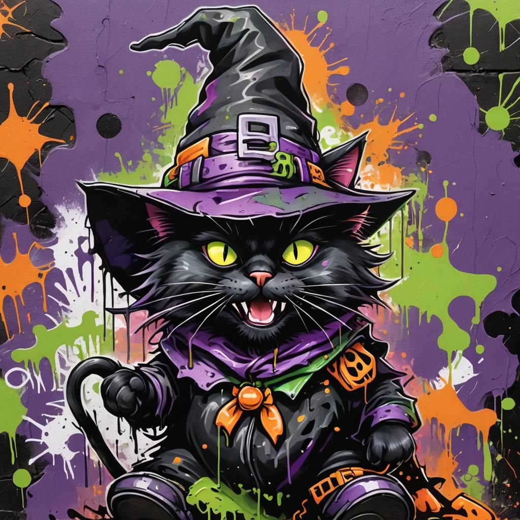 This image shows a cartoon black cat dressed as a witch, holding a trick-or-treat sign. The artwork features bright, graffiti-style elements with dynamic airbrushing, ink splatters, and bold textures in a street art aesthetic.