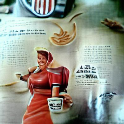 This image depicts a woman in a 1950s Americana style coffee advertisement. It evokes a nostalgic, mid-century aesthetic typical of vintage advertising.