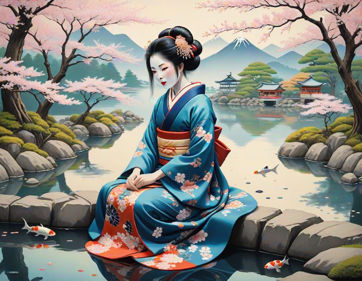 This image showcases a serene geisha in a classic Japanese garden setting, surrounded by vibrant cherry blossoms and koi ponds, rendered in the style of traditional ukiyo-e woodblock prints.