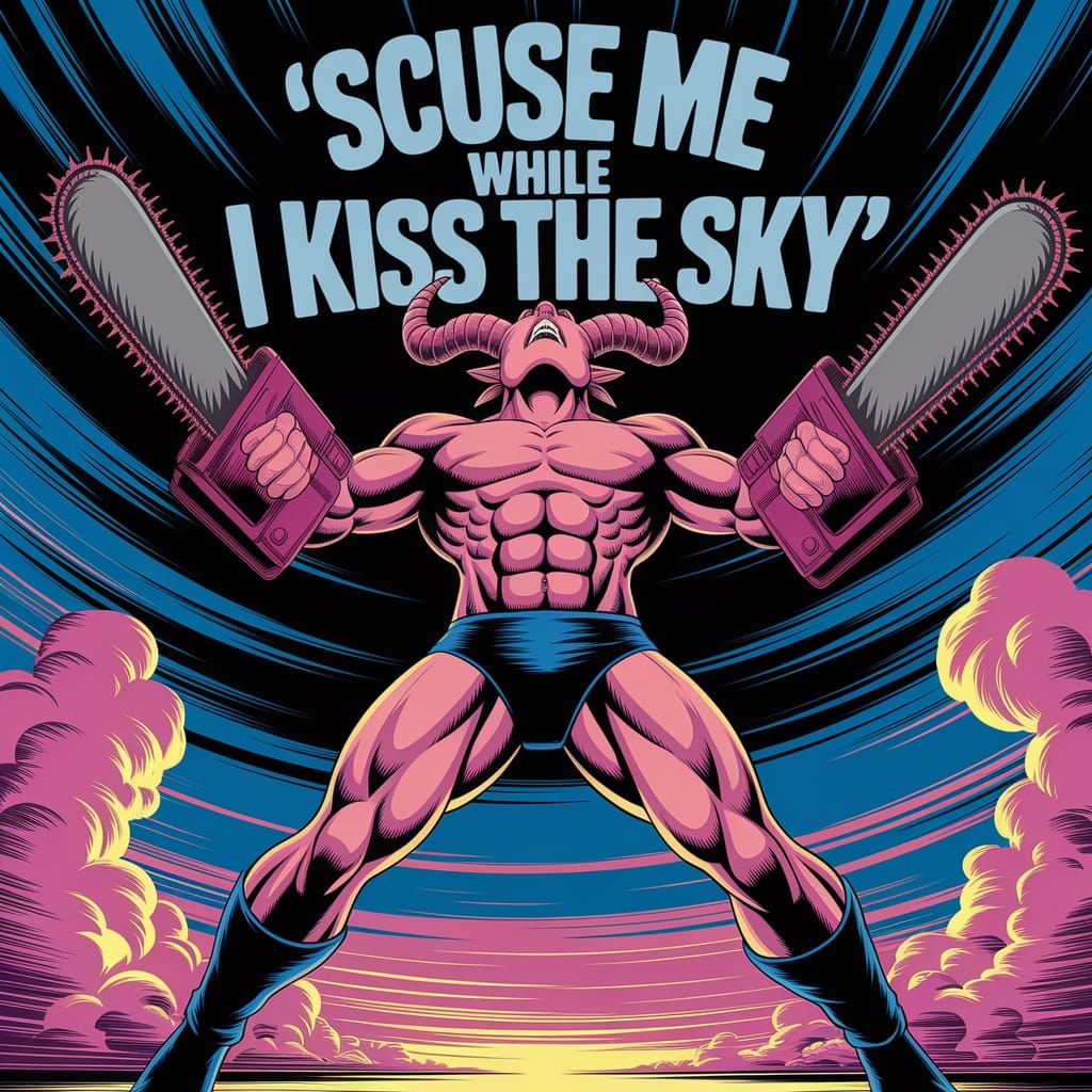 This image shows a muscular, horned figure with chainsaw arms leaping towards a swirling, colorful sky. The figure's lips form the phrase "'scuse me while I kiss the sky" as 3D rendered digital art.