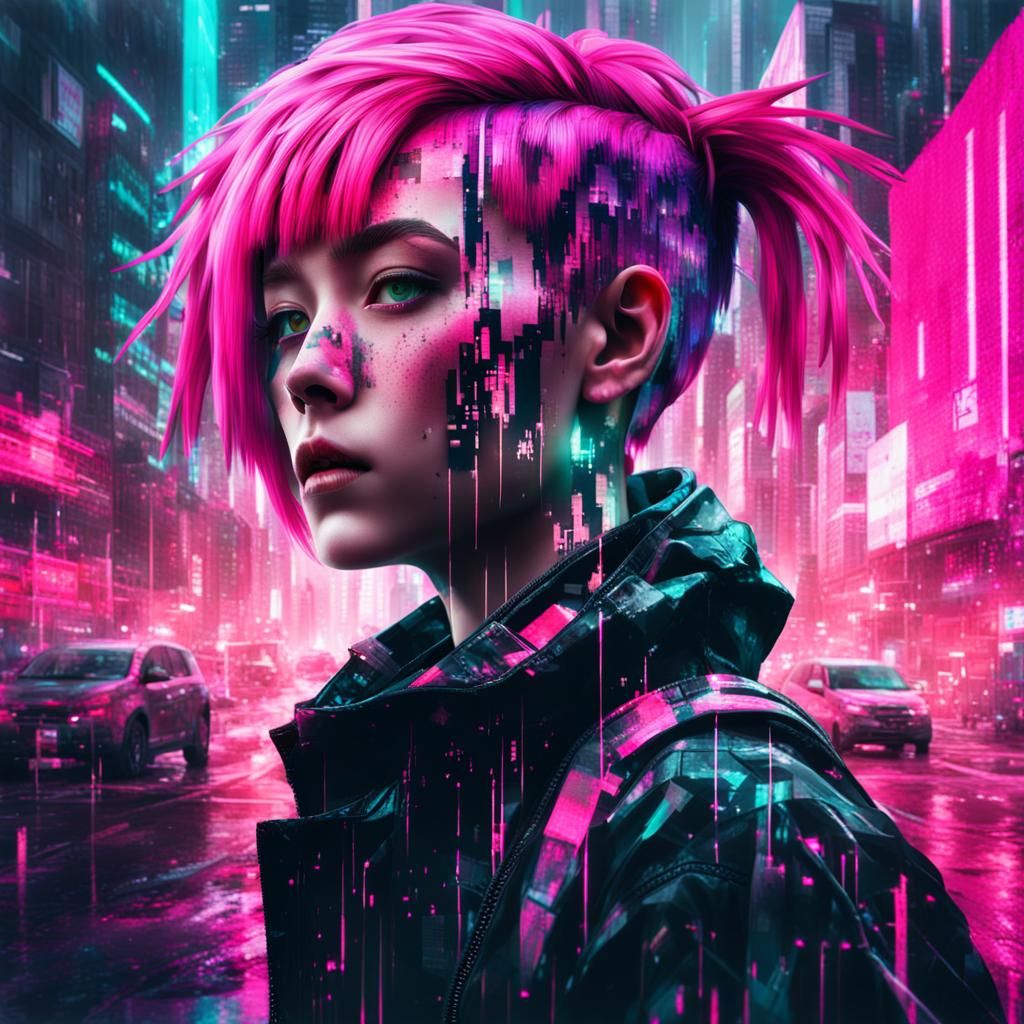 This image shows a cyberpunk-style girl with neon pink hair standing in a glitching, distorted city. The scene is hyperrealistic with intricate details and a moody, atmospheric feel.