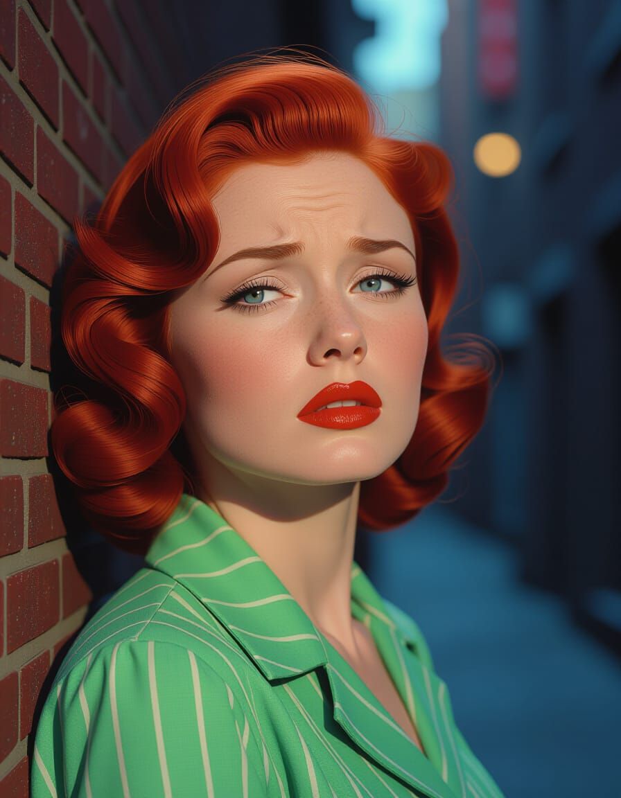 A striking picture of a red-haired woman in a dark alley, dressed in 1940s fashion. The image evokes a film noir aesthetic, with hyperrealistic details and vibrant colors.