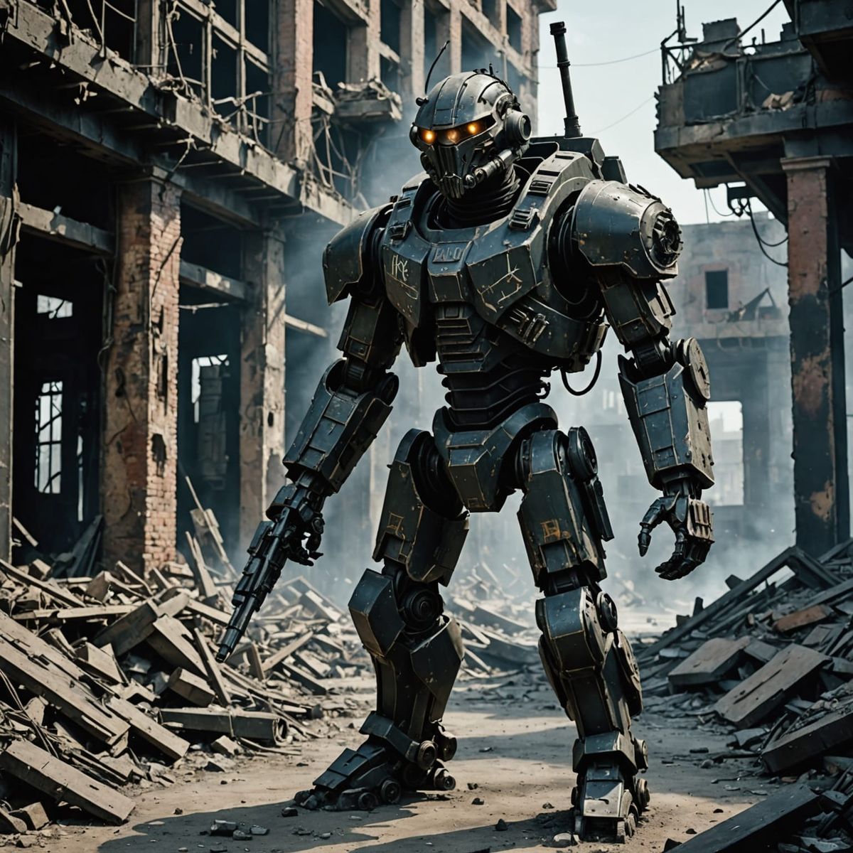 A gritty scene of an APU battling sentinels amidst the ruins of war. The operator valiantly fights from within the battered, sparking exoskeleton in a cyberpunk aesthetic.