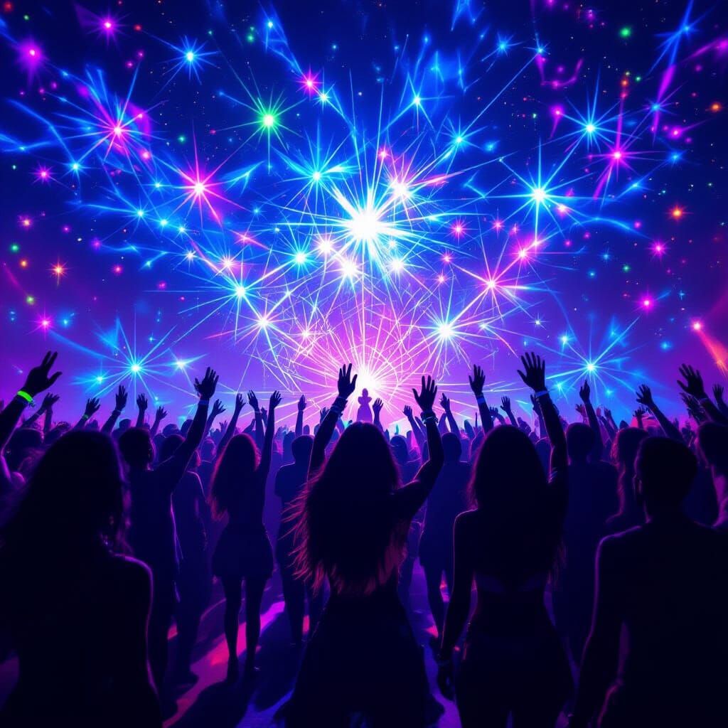 This image captures a dynamic crowd at a Goa trance festival, immersed in a cosmic space filled with psychedelic patterns and nebulae. Vivid neon lights in blue, magenta, and green illuminate the scene, rendered in a maximalist digital art style.