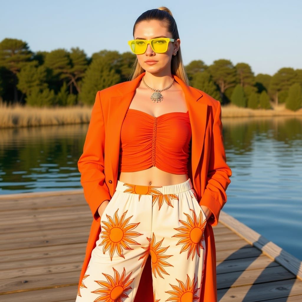 A woman poses on a dock wearing an orange crop top, cream pants with a sun print, and a flowing jacket. The image evokes a casual chic style with warm colors.