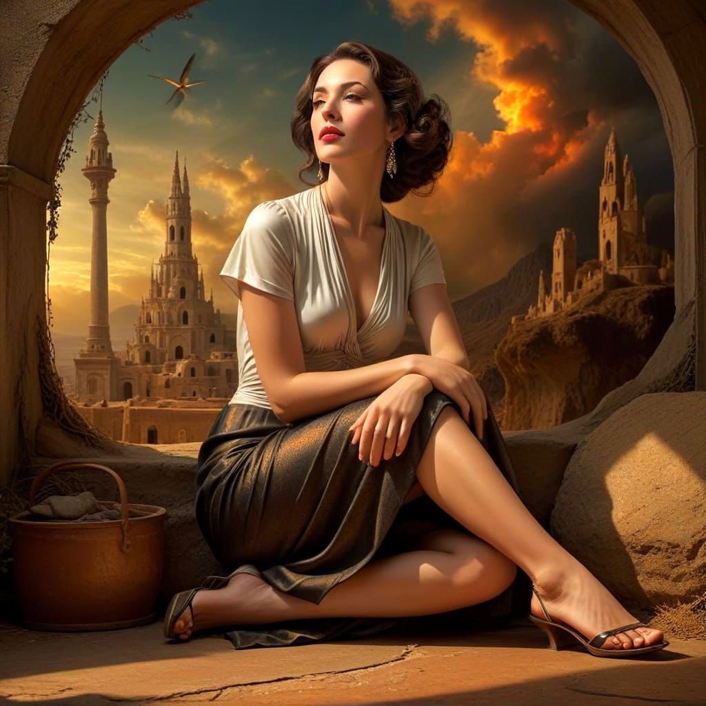 full-height photorealistic mystical mysterious enigmatic lady in mystical fantastic surreal scene, spectacular fantastic surreal otherworldly background, expressive, intense, evocative, liminal, nostalgic, beautiful, compelling, captivating, mesmerizing, enigmatic, intriguing, suspenseful, enthralling, ...