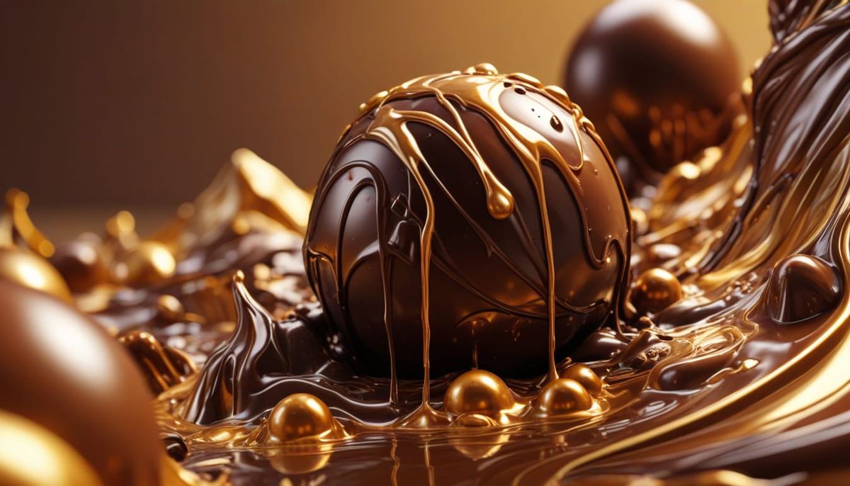 This is a 3D digital art masterpiece showcasing a surreal chocolate sculpture. Macro photography captures vibrant colors, melting edges, and smooth textures with high contrast and warm golden lighting.