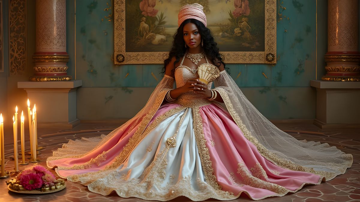 This image depicts Erzulie Freda, the loa of love and beauty, in a stunning Haitian Vodou ceremonial outfit, exuding elegance and refinement. The ornate silk and lace gown, intricately embroidered with gold thread, is adorned with sparkling jewelry and features a luxurious perfume bottle and dainty fan.