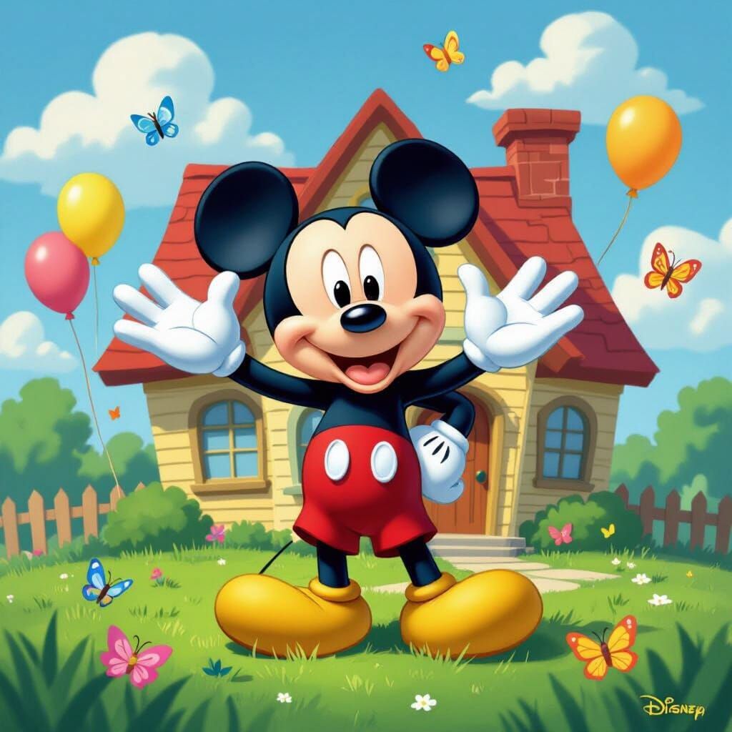 This image shows Mickey Mouse waving in front of his house. The scene is very vibrant, with a bright blue sky, green grass, and sunshine, in a Disney-inspired animation style.