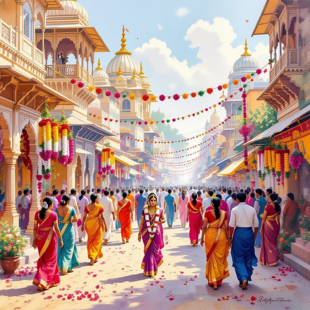 This image shows a vibrant Indian street scene during the Janmashtami festival. People are adorned in colorful traditional clothes, temples are decorated, with flower garlands, and intricate details reminiscent of Mughal paintings.
