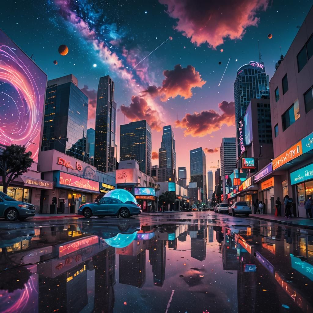 A surreal, wide-angle view of a futuristic Los Angeles at dusk. The neon-lit cityscape is reflected on wet pavement under swirling clouds and stardust, in a neon noir aesthetic.